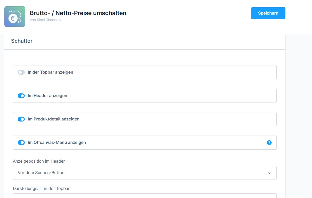 Sobald das Plugin aktiviert ist, können Kunden zwischen Brutto und Netto umschalten. In den Einstellungen des Plugins können noch folgende Anpassungen vorgenommen werden. Vorauswahl der Brutto oder Nettopreise. Festlegung, wo der Schalter für den Swich angezeigt werden soll und die Kundengruppenzuweisung nach der Registrierung.