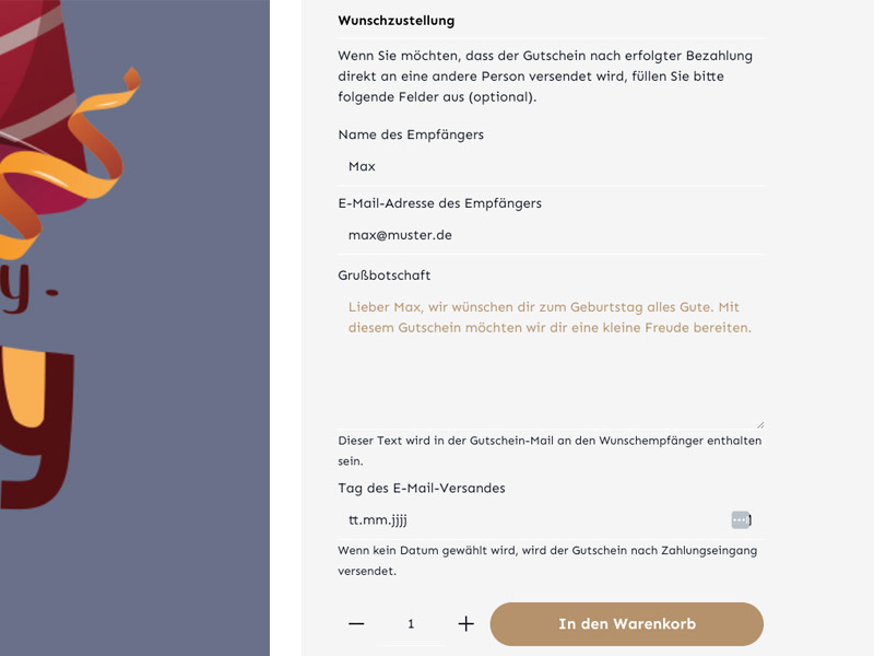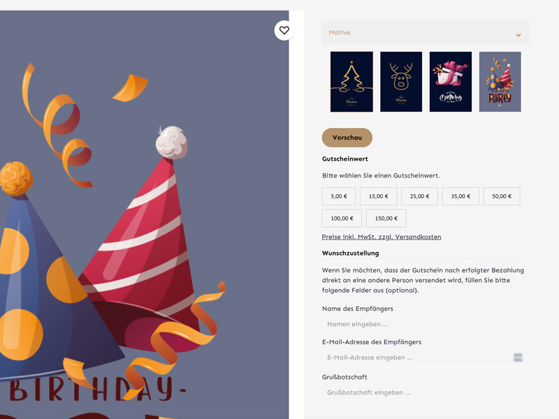 Verschenken leicht gemacht! Mit unserer Shopware-Erweiterung kannst du Gutscheine direkt per Mail versenden. Einfach den Betrag wählen, eine persönliche Grußbotschaft hinzufügen und sofort Freude bereiten. Perfekt für spontane Geschenke und besondere Anlässe!