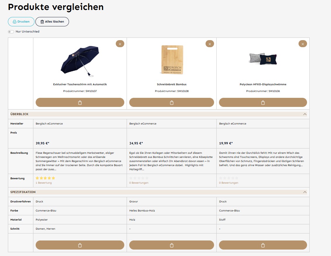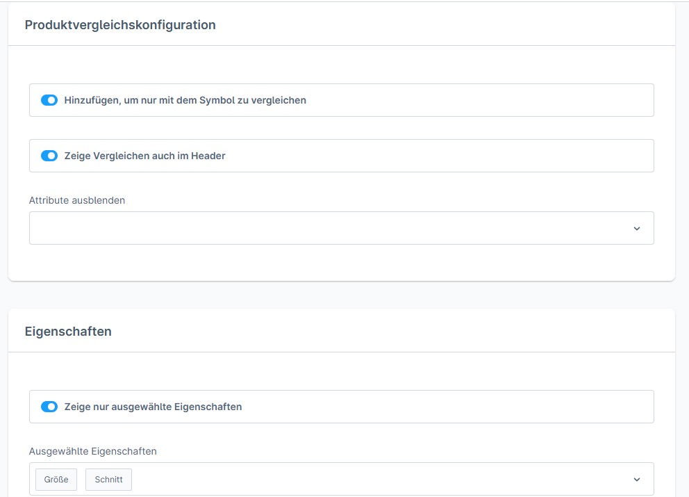 Es können in der Produktvergleichskonfiguration folgende Einstellungen vorgenommen werden: Hinzufügen, um nur mit dem Symbol zu vergleichen und Zeige Vergleichen auch im Header. Es können weiter nur ausgewählte Eigenschaften ausgewählt werden.