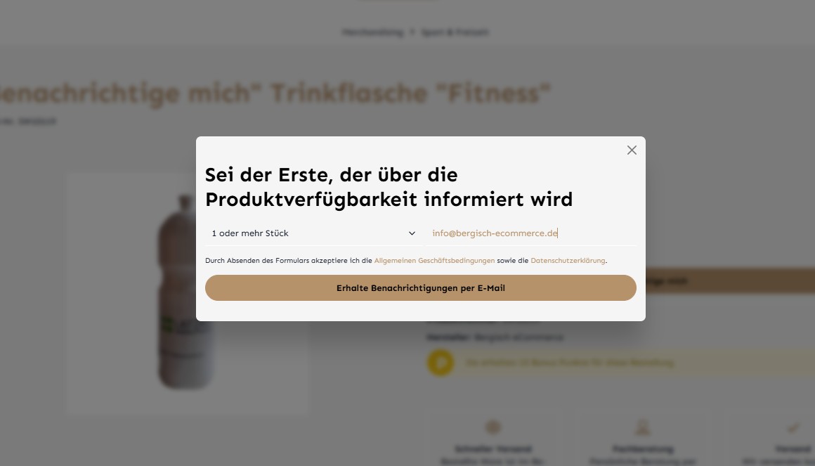 Aktiviere das Plugin und entscheide selbst, wie deine Kunden benachrichtigt werden sollen — per Mail, SMS oder WhatsApp. Zusätzlich kannst du personalisierte Angebote einfügen und dich automatisch per E-Mail informieren lassen, sobald der Lagerbestand unter deinen gewünschten Mindestwert fällt.